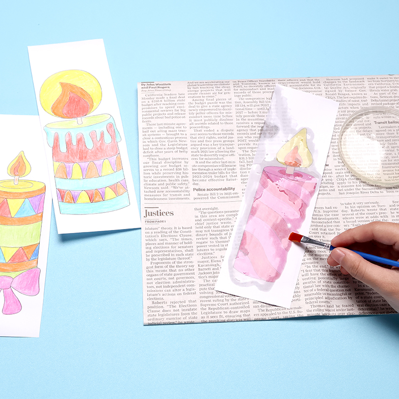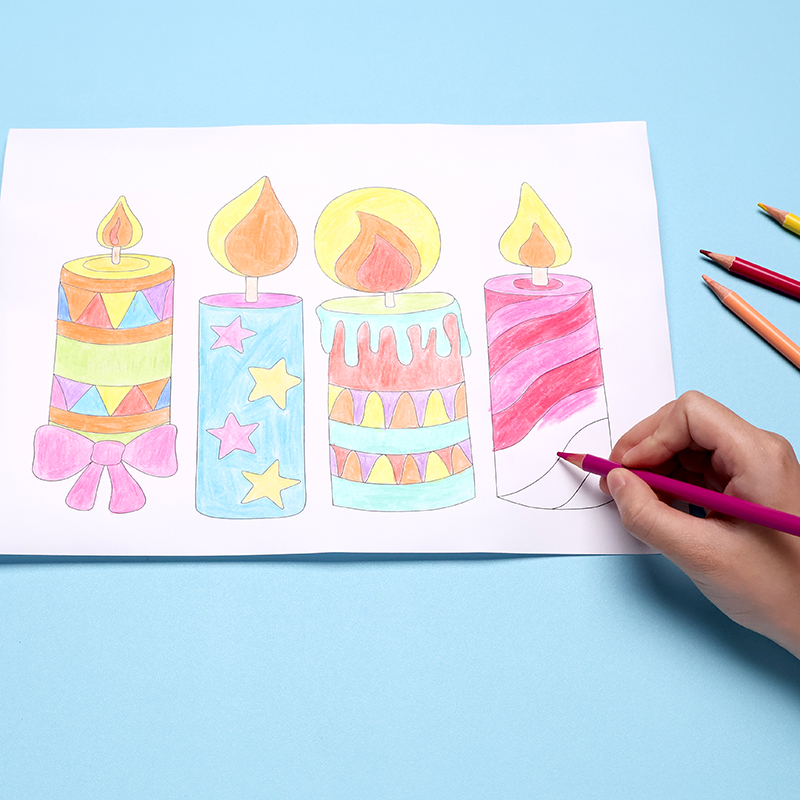 Die Vorlagen sind bewusst schlicht gehalten und bieten viel Raum für eigene Farbideen – jede Kerze wird so zu einem ganz persönlichen Kunstwerk. Mit einem einfachen Trick entfalten sie ihre volle Wirkung: Nach dem Ausmalen wird die Rückseite mit etwas Öl bestrichen, wodurch das Papier durchscheinend wird. Am Fenster angebracht, leuchten die Kerzen dann wie kleine Glasbilder.