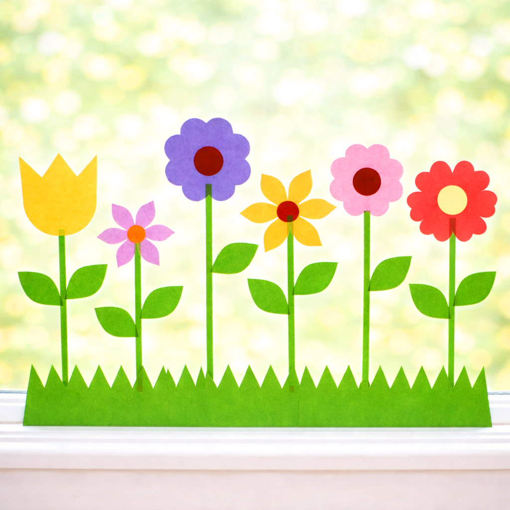 8 Schneidevorlagen für Kinder zum Basteln von frühlingshaften Fensterbildern mit Blumen, Stielen, Blättern und Gras. Die Fensterblumen sind eine süße Fensterdeko zum Malen, Schneiden und Kleben für Kinder.
