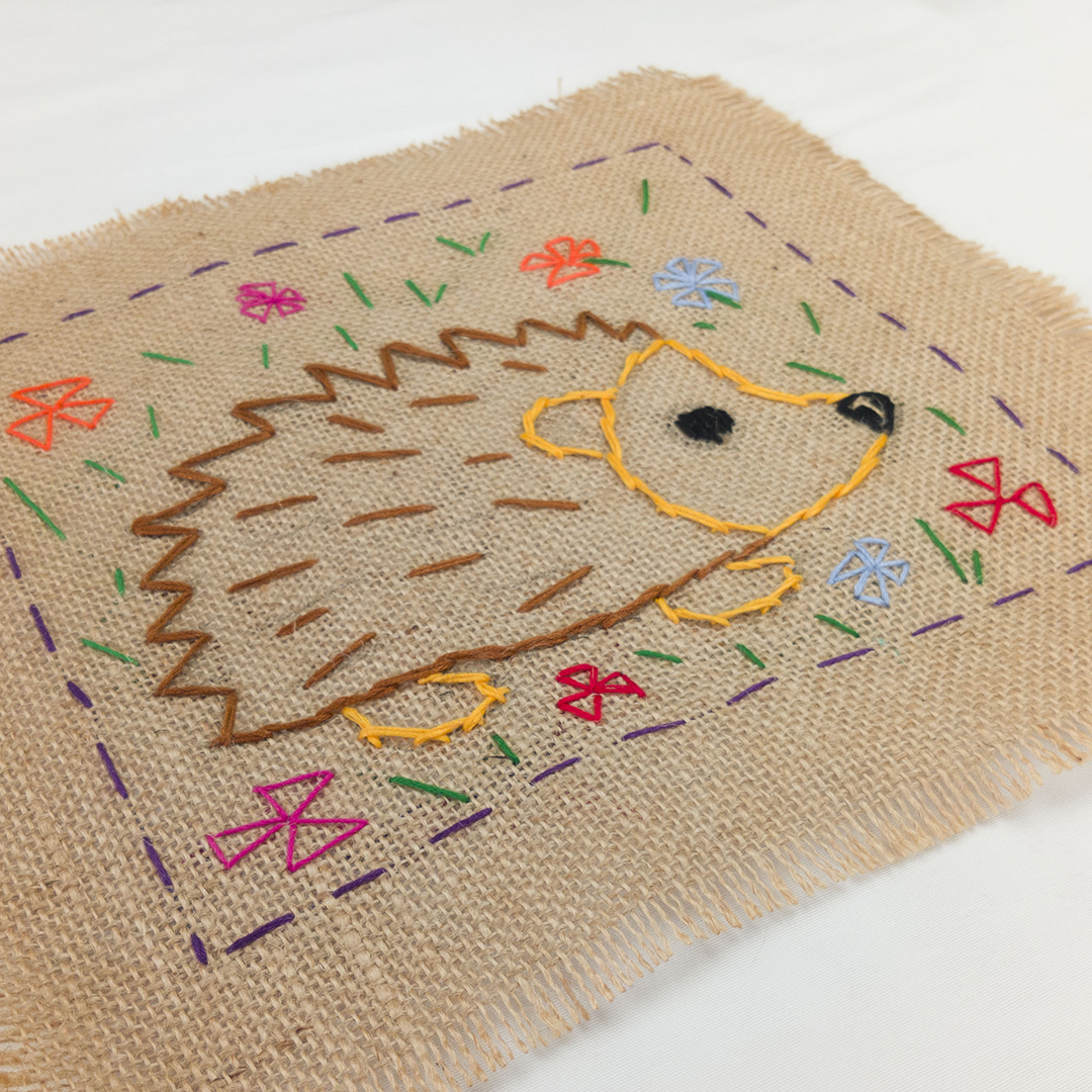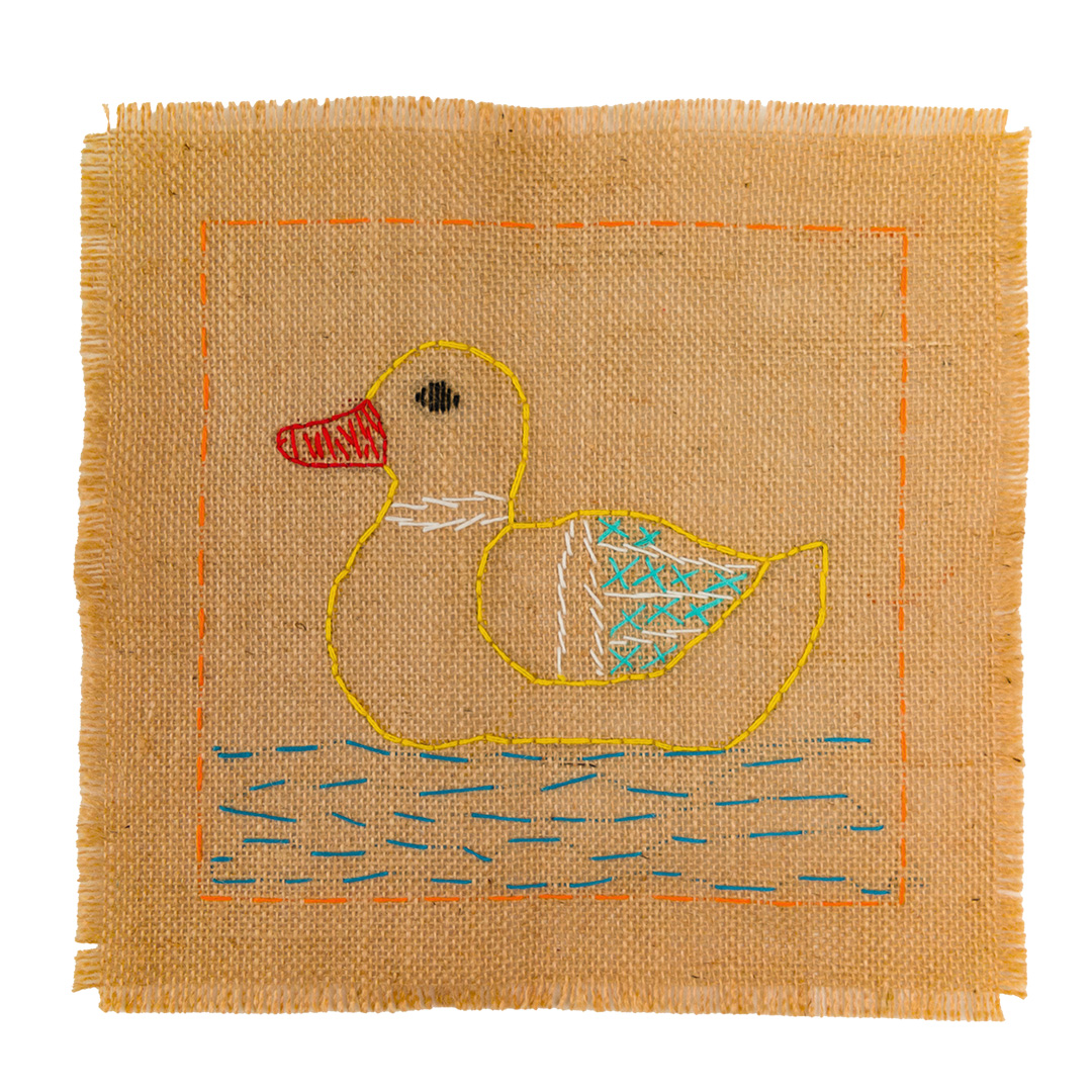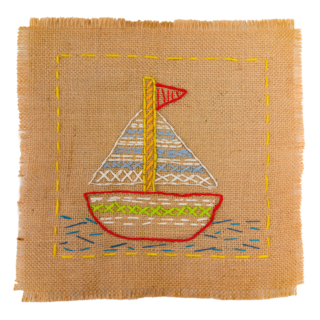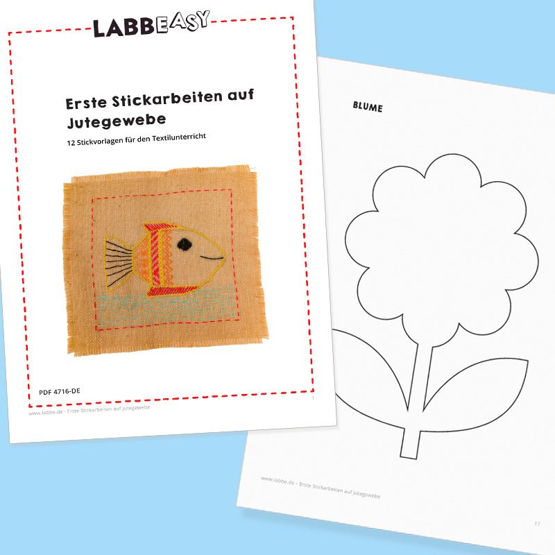 Die Kinder übertragen die gewünschte Vorlage auf das grob gewebte Jutegewebe und sticken zuerst die Konturen nach. Anschließend gestalten sie die Flächen mit verschiedenen Grundstichen, die Schritt für Schritt ausprobiert werden können. Durch die gut sichtbare Struktur der Jute lassen sich die Stiche besonders leicht umsetzen – perfekt für erste Stickversuche.