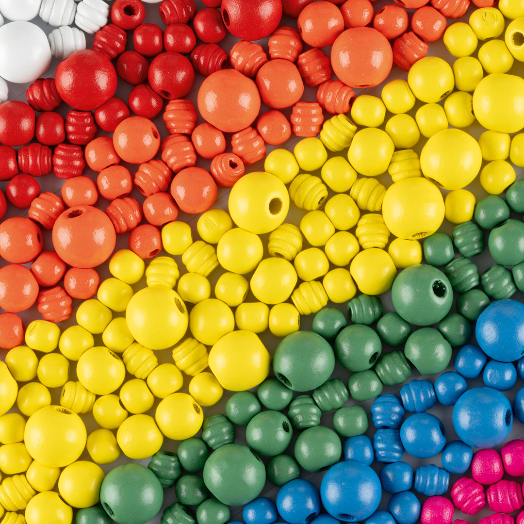 Durch ihre angenehme Größe lassen sich die Perlen gut greifen und fördern spielerisch Feinmotorik, Hand-Auge-Koordination und Konzentration. Die Öffnung der Perlen beträgt ca. 1,5 – 3 mm. Sie passen damit perfekt auf unsere Fädelschnüre – ideal für Ketten, Armbänder, Mobiles oder saisonale Dekoideen.