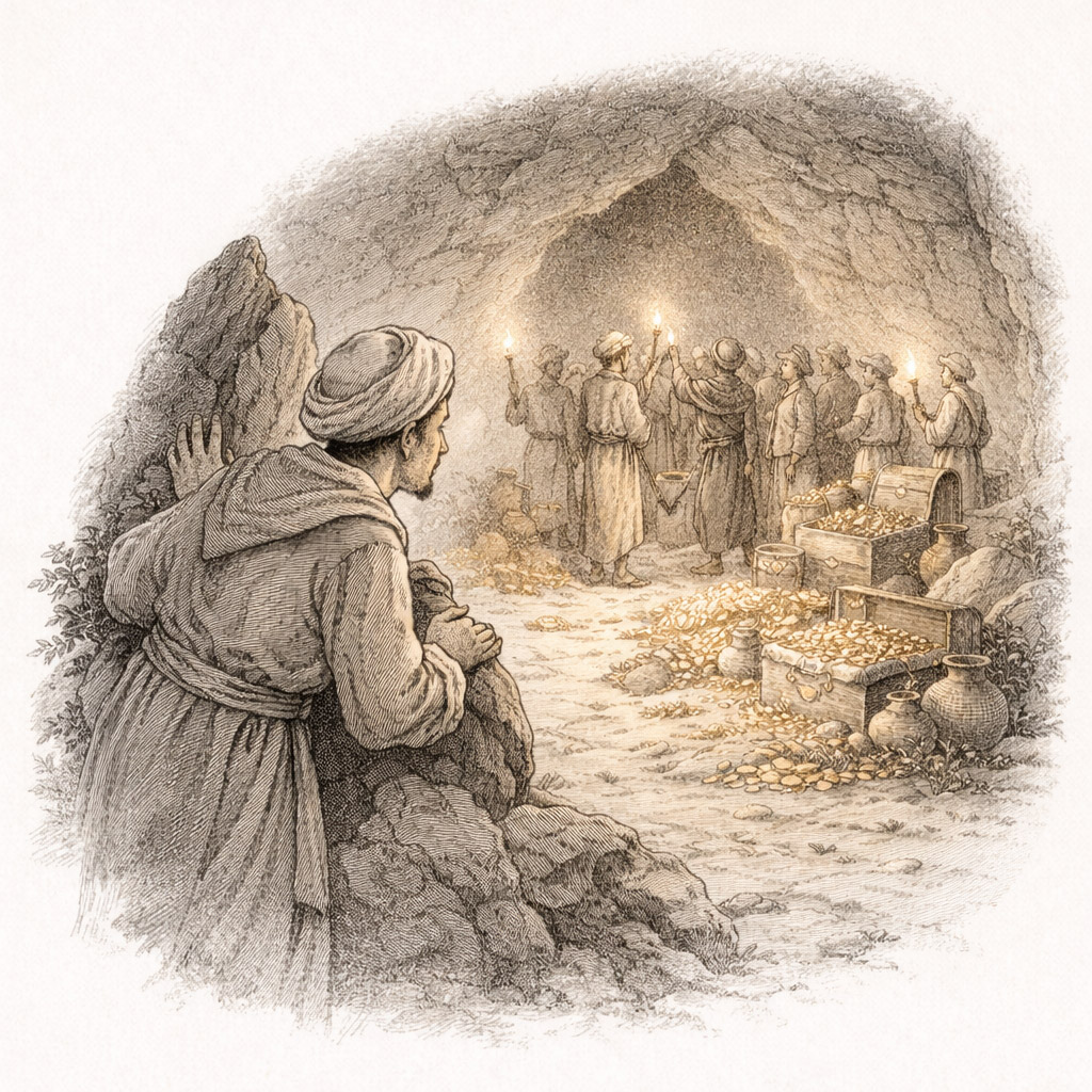 Vierzig Räuber waren es. Sie schienen eine Karawane überfallen zu haben, und sie planten, ihr Diebesgut in einem Versteck in Sicherheit zu bringen. Zu dem Zweck banden sie ihren Pferden die Vorderfüße aneinander. Danach nahmen sie ihnen die Satteltaschen ab. Ali Baba erkannte, dass die Taschen mit Gold und Silber gefüllt waren.