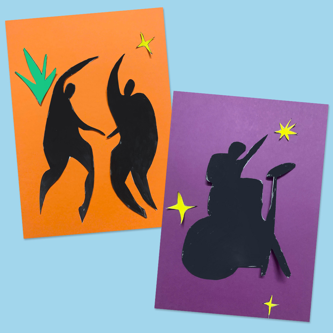 Die Figuren werden ausgemalt, ausgeschnitten und zu einer eigenen Collage auf einem farbig gestalteten Hintergrund arrangiert. Kleine zusätzliche Elemente wie Sterne, Herzen oder Kreise ergänzen die Komposition und eröffnen vielfältige Gestaltungsmöglichkeiten. So entstehen eindrucksvolle Bilder, die Bewegung, Rhythmus und Ausdruck sichtbar machen.