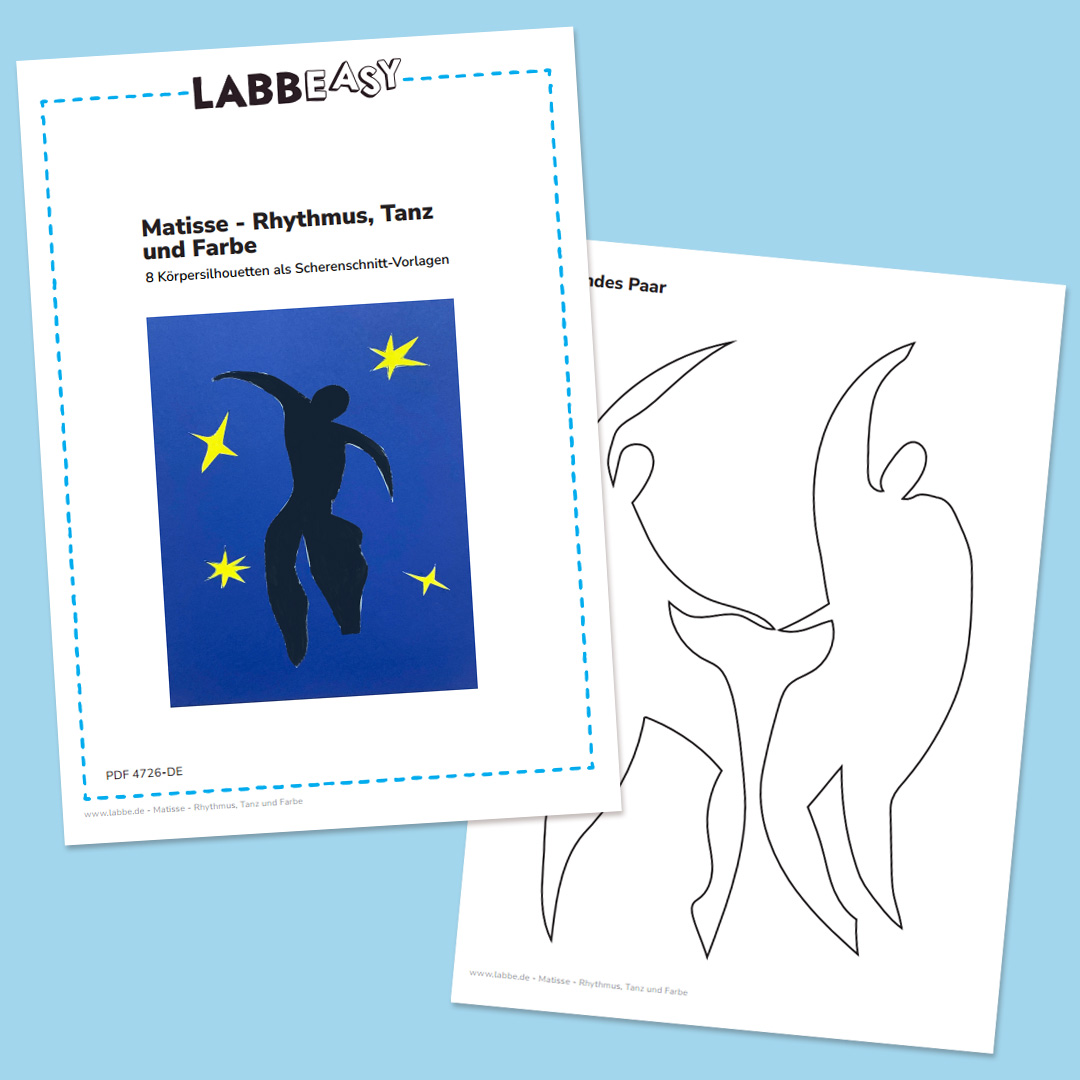 8 ausdrucksstarke Körpersilhouetten als Scherenschnitt-Vorlagen – inspiriert von Henri Matisses berühmten Papier-Collagen. Die Motive wie „Der fallende Ikarus“, „Dynamischer Tänzer“, „Tanzendes Paar“ oder „Trommler“ greifen die klare, reduzierte Formensprache des Künstlers auf und laden Kinder dazu ein, selbst gestalterisch tätig zu werden.