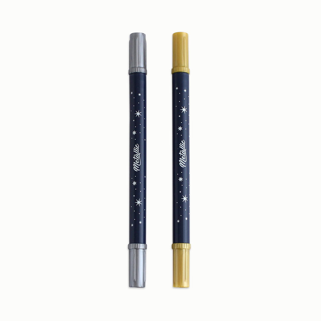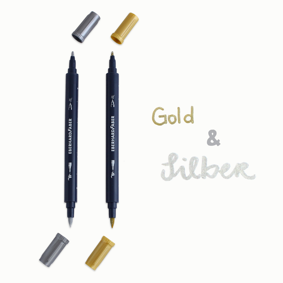 2 Marker in gold und silber, mit jeweils einer dünnen Spitze von 0,8 mm Ø und einer Pinselspitze mit 1 bis 10 mm Ø. Die Stifte sind für helle und dunkle Papiere geeignet sowie haltbar auf allen glatten Oberflächen wie Glas Porzellan Stein oder Kunststoff.