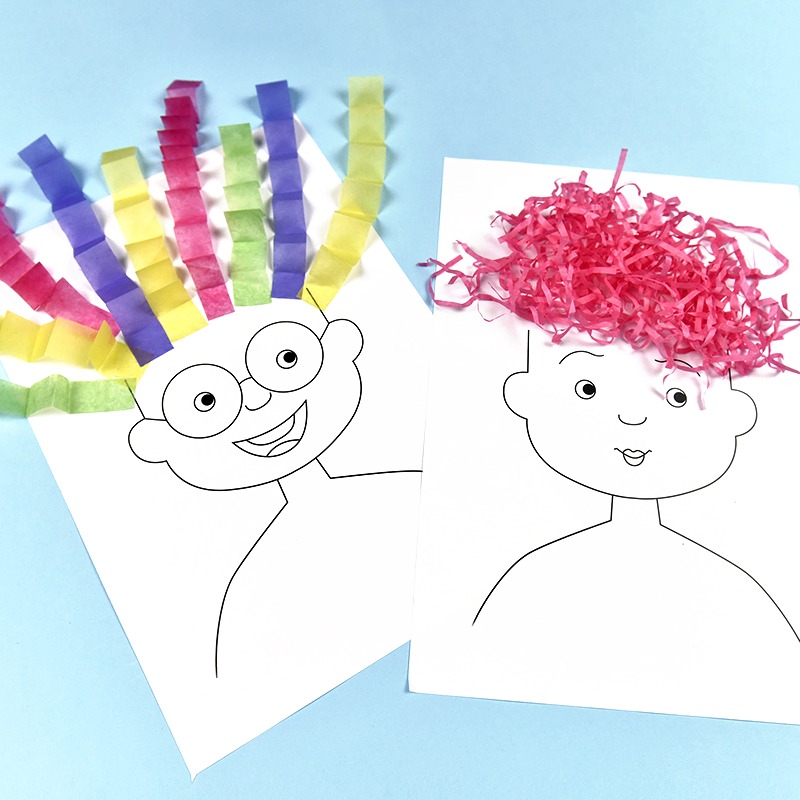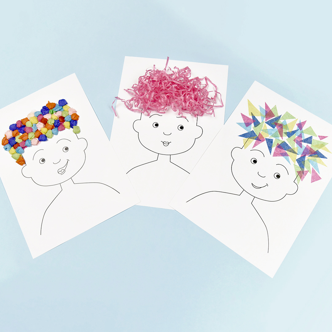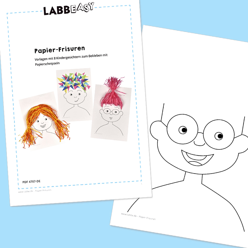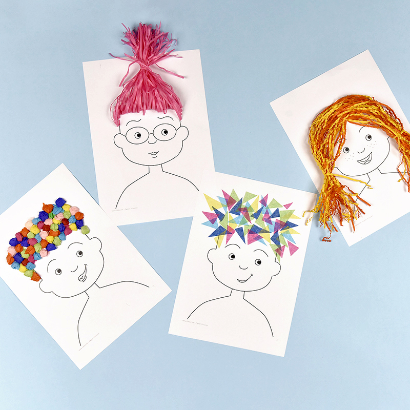 Mit diesem PDF können Kinder kreative Frisuren aus bunten Papierresten und Schnipseln gestalten. Enthalten sind acht verschiedene Kindergesichter zum Ausdrucken, die nach Lust und Laune mit den verschiedensten Materialien beklebt und individuell gestaltet werden können.