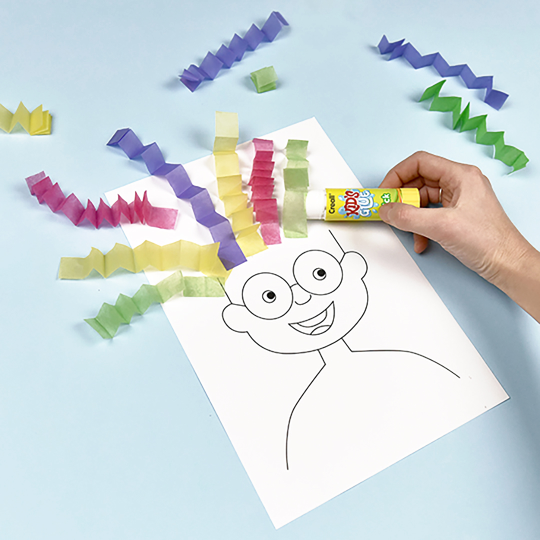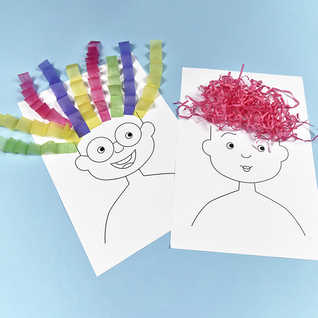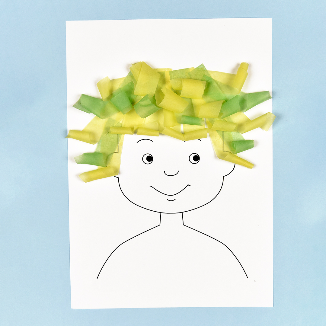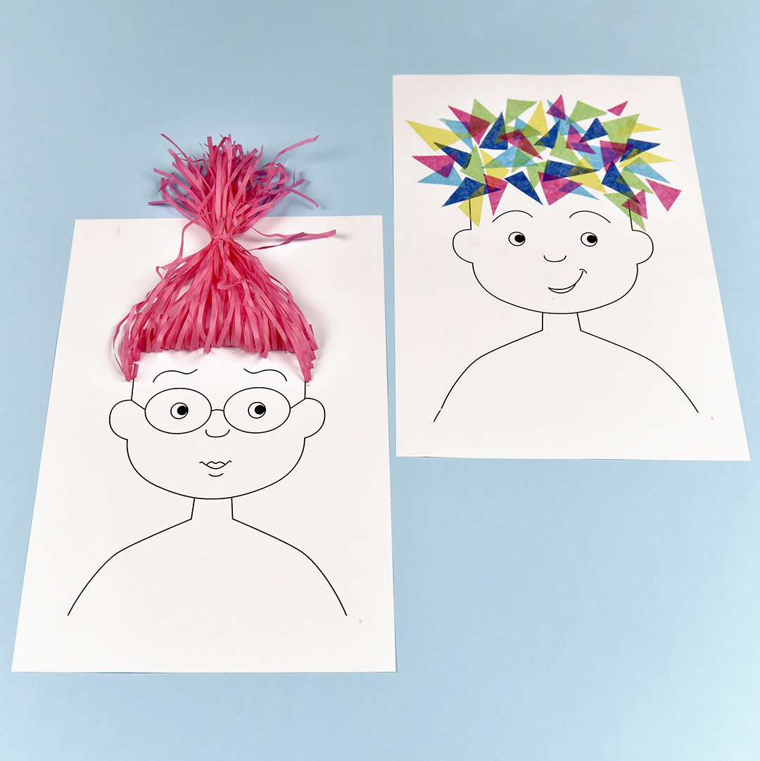 Ob lange Zöpfe aus Papierstreifen, geknüddelte Seidenpapierlocken oder flatternde Frisuren aus Transparentpapier – der Fantasie sind keine Grenzen gesetzt. Dieses witzige Projekt eignet sich hervorragend für die Kita, die Schule oder das kreative Basteln zu Hause. Neben dem Spaß am Gestalten werden Feinmotorik und Kreativität spielerisch gefördert.