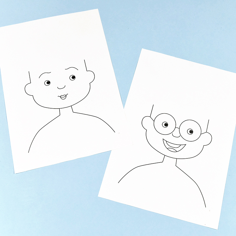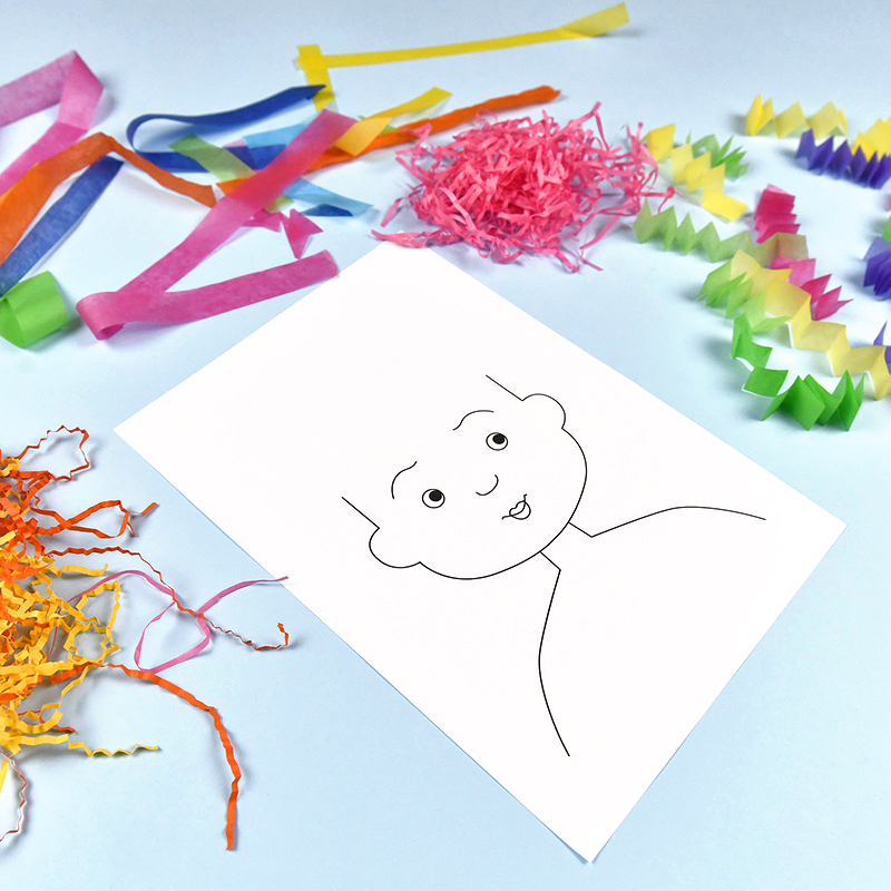 Kreative Frisuren erfinden: 8 Kindergesichter zum Gestalten mit bunten Papierresten.