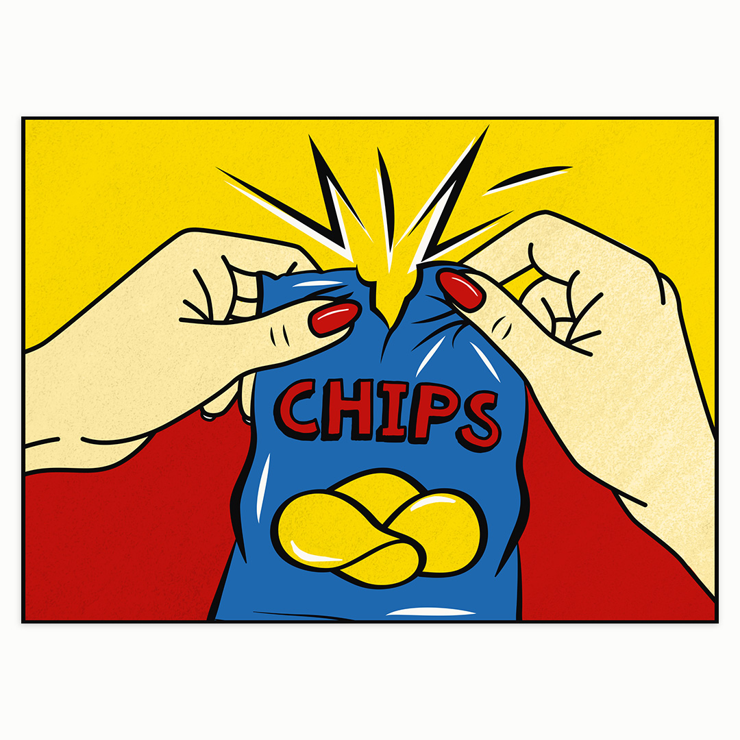 Die Motive zeigen bewusst reduzierte Bildausschnitte wie Hände und Gegenstände – ganz im Stil der Pop-Art der 1960er-Jahre. Klare Linien, starke Kontraste und plakative Farben machen aus einfachen Alltagssituationen eindrucksvolle Kunstwerke.
