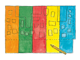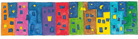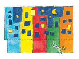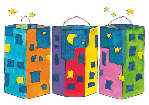 1. 5 Laternenwände aneinanderkleben und unterschiedlich hohe Hochhäuser mit vielen Fenstern aufzeichnen. Mindestens zwei gegenüberliegende Häuser müssen für die Laternenbügel ganz hoch bleiben. Die Häuser an den Rändern und die Fenster ausschneiden.