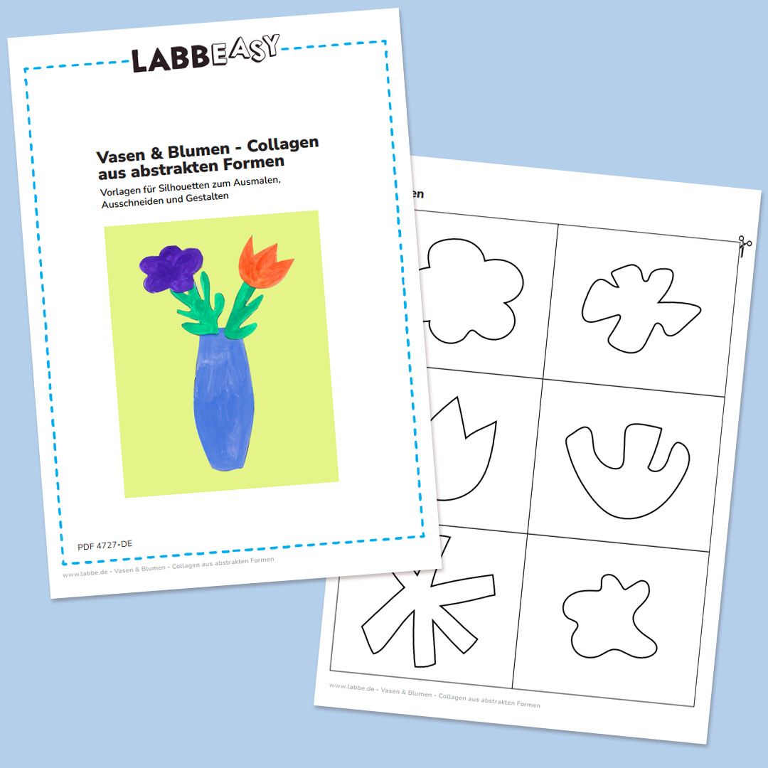 18 Vorlagen für Silhouetten von Vasen, Blüten und Blättern zum Ausmalen, Ausschneiden und Gestalten eigener Blumen-Collagen. Die Formen sind bewusst vereinfacht: klare Umrisse, keine Details, keine Farb-Vorgaben. Kinder gestalten die Elemente selbstständig mit kräftigen Farben und setzen sie anschließend zu einer eigenen Collage zusammen.