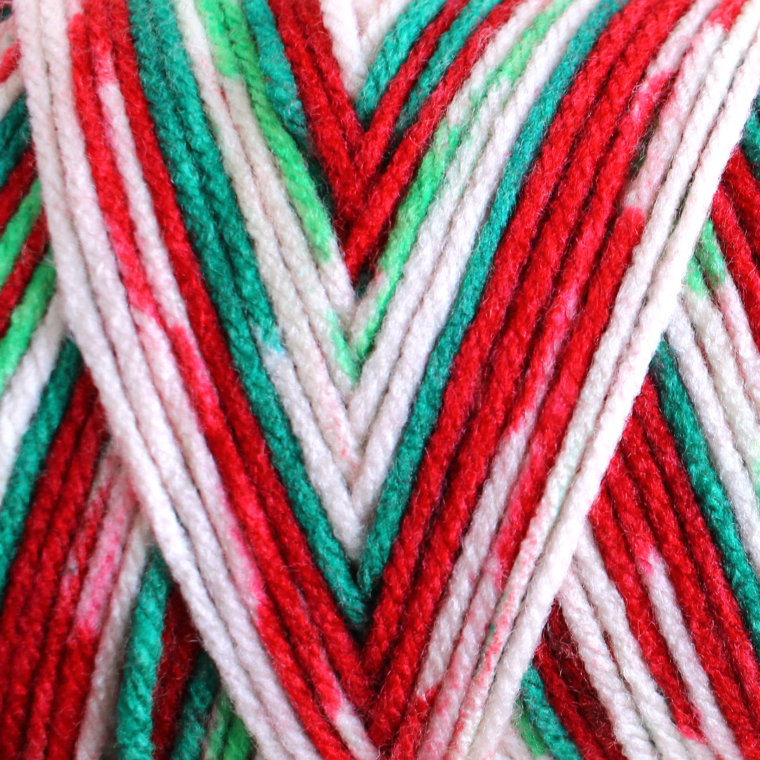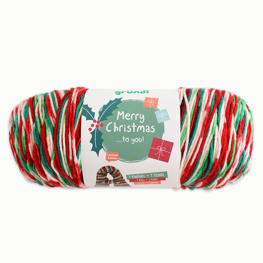 Dieses weihnachtliche Riesenknäuel in den Verlaufsfarben weiß-rot-grün reicht für einen langen, kuscheligen Schal und eignet sich wunderbar zum Häkeln und Stricken.