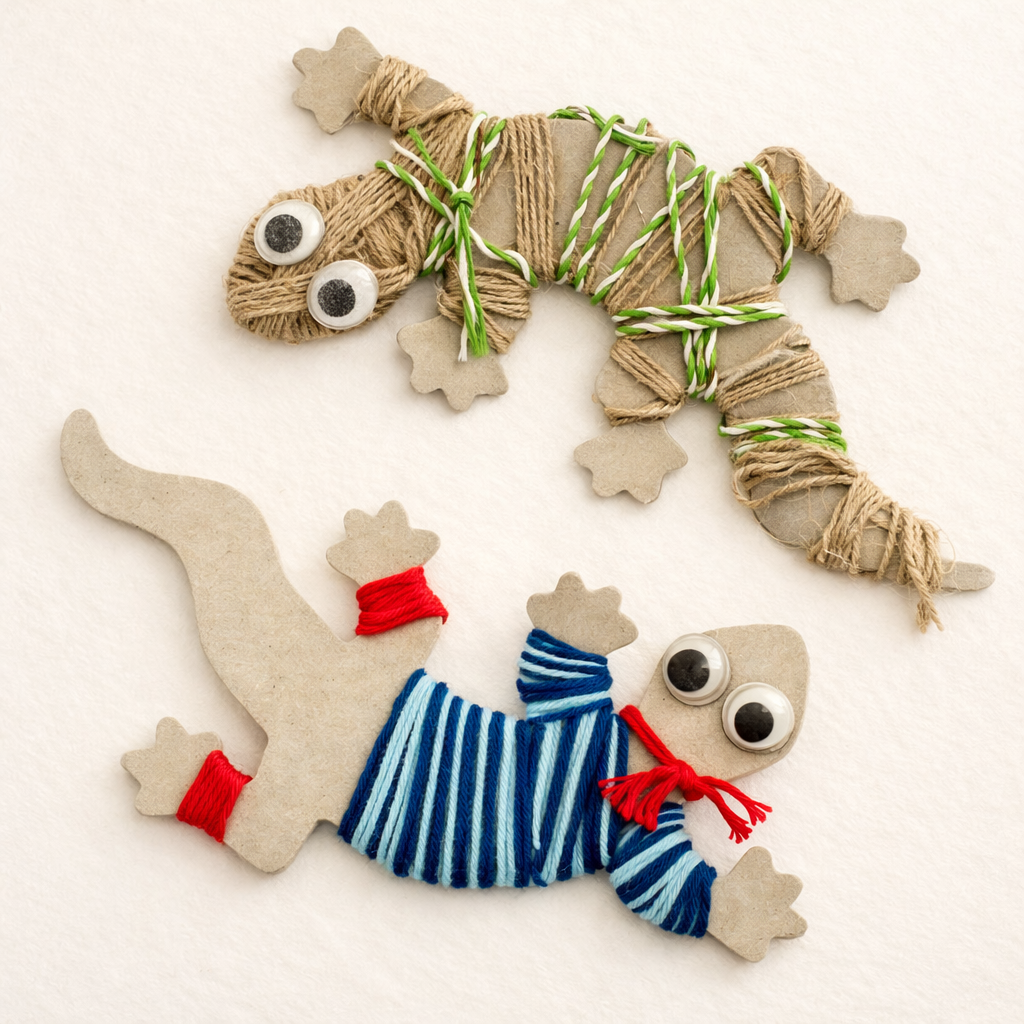 Wickelgeckos aus gestanztem grauem Karton für erste Wickeltechniken. Ideal auch zum Aufbewahren von Woll- und Garnresten.