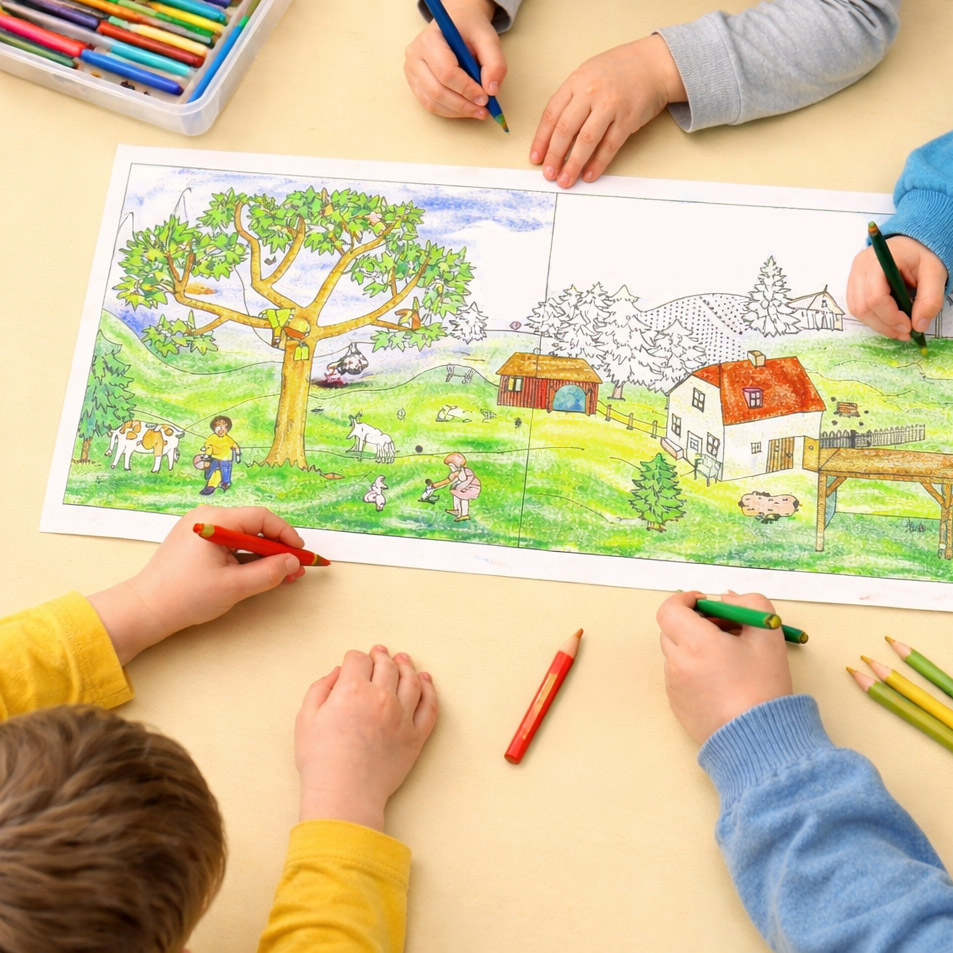 Für das kreative Wimmelbild werden eigene Motive in das Panoramabild gemalt. Dabei wird nicht nur die Feinmotorik geschult, sondern auch die Phantasie der Kinder angeregt und die Kreativität gefördert.
